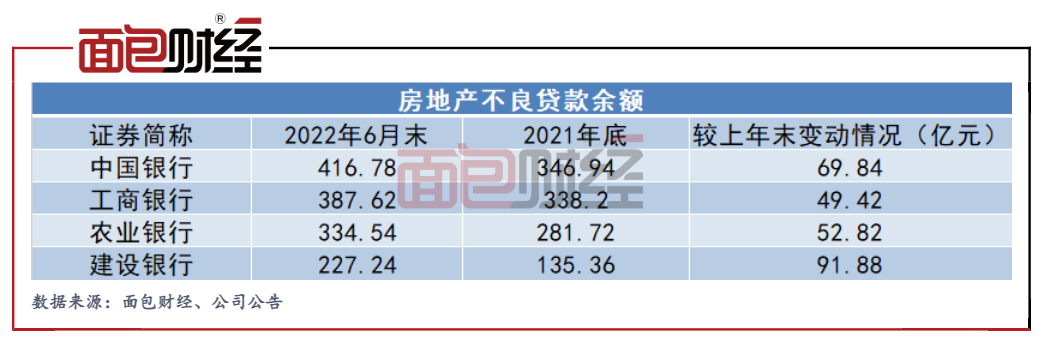 从不良贷款余额来看,截至2022年6月末,中国银行的房地产业不良贷款余额为416.78亿元,较上年末增加69.84亿元,同样居四大行首位。