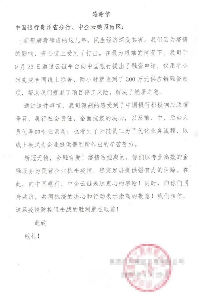 2022年9月23日,中企云链收到了来自陕西某建设工程公司发来的感谢信。该公司是贵州某央企的上游供应商,在贵阳疫情防控期间,由于项目需要急需融资。中企云链通过“线上签约+线上融资”的方式,帮助企业及时解决融资难题,避免了项目停工风险。