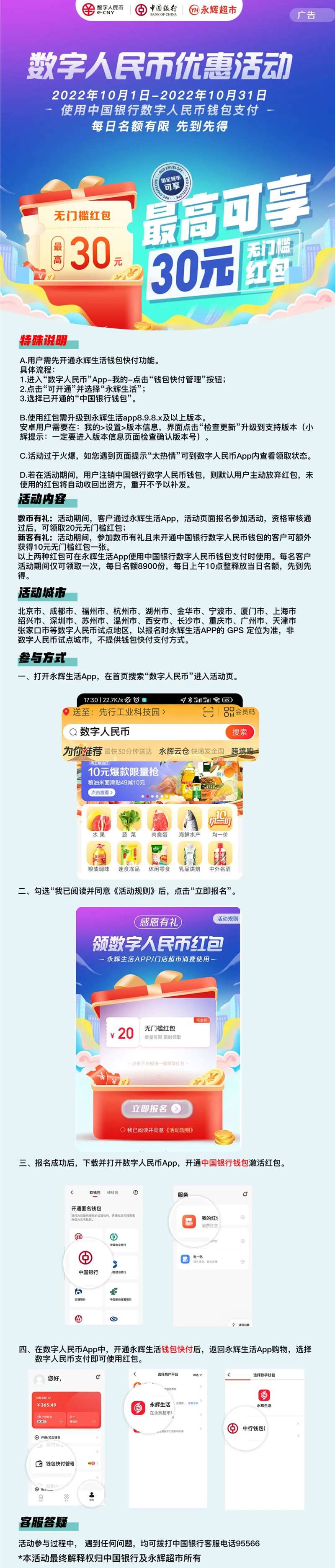 活动期间,用户可通过永辉生活App活动页面报名参加,资格审核通过后,可领取20元无门槛红包。除此之外,活动期间首次开通中国银行数字人民币钱包的用户可额外获得10元无门槛红包一张。