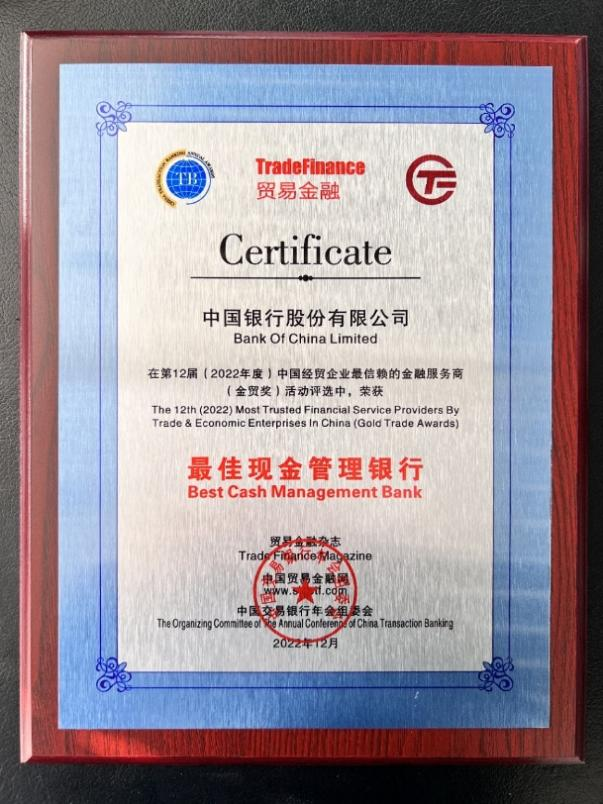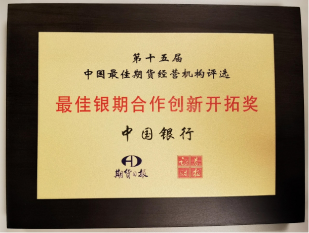 近日,第十五届中国最佳期货经营机构与第十二届中国经贸企业最信赖的金融服务商(金贸奖)评选结果对外公布,中国银行分别荣膺“最佳银期合作创新开拓奖”“最佳现金管理银行”。
