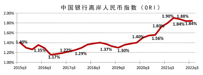 近日,中国银行发布2022年第三季度离岸人民币指数(ORI)。结果显示,2022年第三季度末,中国银行离岸人民币指数(ORI)为1.84%,与第二季度末持平。