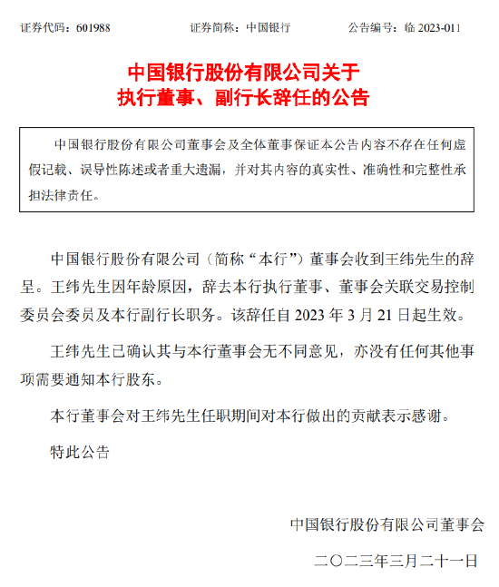3月21日,中国银行发布公告称,董事会收到王纬的辞呈。王纬因年龄原因,辞去该行执行董事、董事会关联交易控制委员会委员及该行副行长职务。该辞任自3月21日起生效。