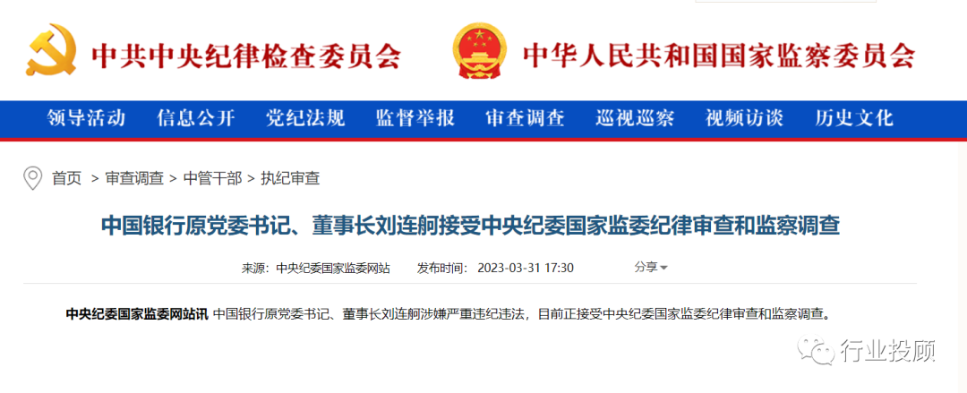 中国银行原党委书记、董事长刘连舸涉嫌严重违纪违法,目前正接受中央纪委国家监委纪律审查和监察调查。