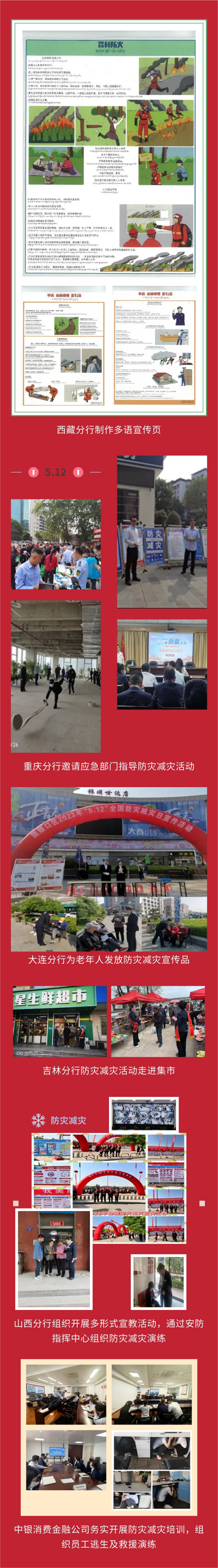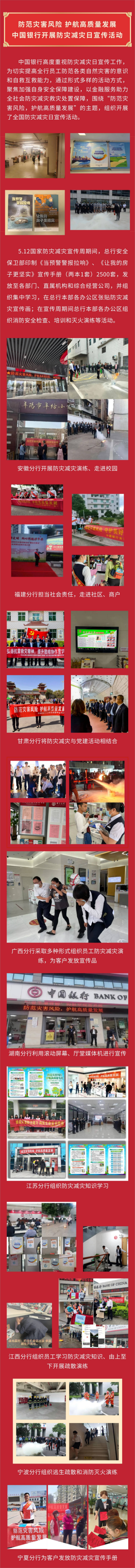 中国银行通过形式多样的活动方式,聚焦加强自身安全保障建设、以金融服务助力全社会防灾减灾救灾处置保障,围绕“防范灾害风险,护航高质量发展”为主题,组织开展了防灾减灾日宣传活动。