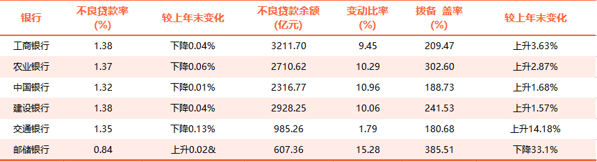国有六大行不良贷款余额较上年末均有所上升,但不良率有5家银行较上年末有所下降,仅1家邮储银行有所提升。中国银行虽然不良贷款率有所下降,同时拨备覆盖率提升,但纵观国有六大行均在资产质量方面降低了风险水平,而中国银行的表现并不突出。