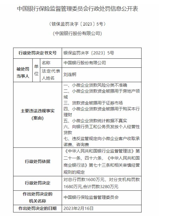 值得注意的是,2月16日,中国银行因贷款被挪用于证券地产等7宗违规被罚3280万元。