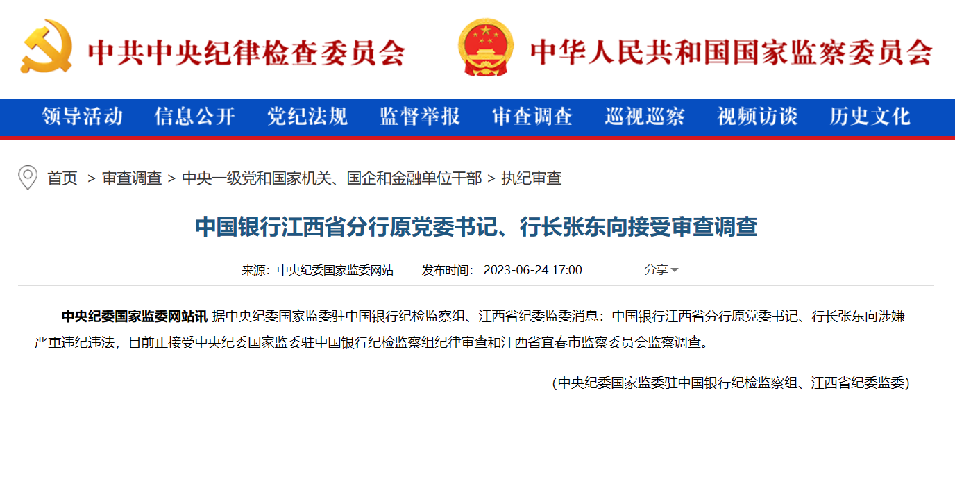 据中纪监委官网2023年6月24号消息:中国银行江西省分行原党委书记、行长张东向涉嫌严重违纪违法,目前正接受中央纪委国家监委驻中国银行纪检监察组纪律审查和江西省宜春市监察委员会监察调查。
