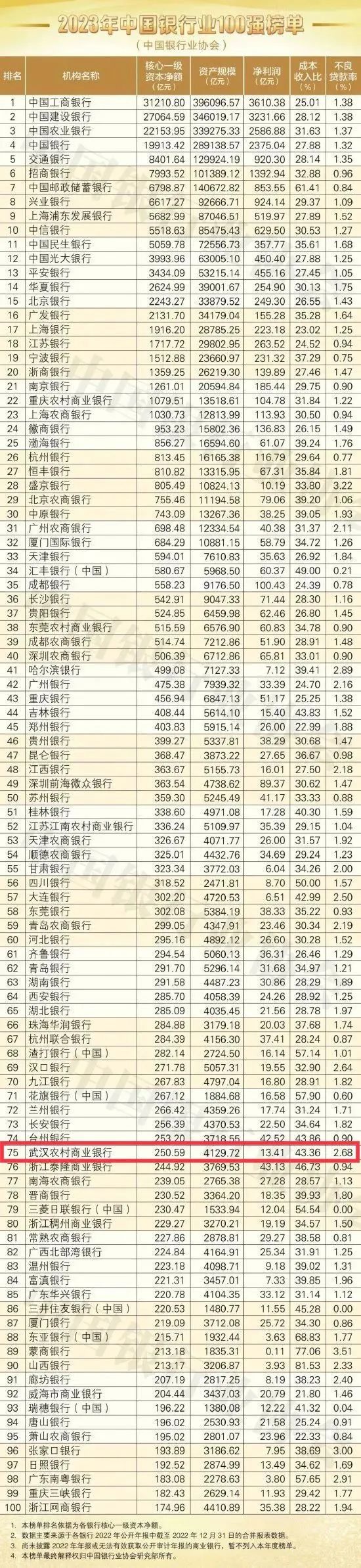 2023年度银行业100强中,武汉农村商业银行以4129.72亿元的资产规模、13.41亿元的净利润荣登榜单,排名榜单第75位。重庆农商银行、上海农商银行、北京农商银行等16家农村商业银行上榜。