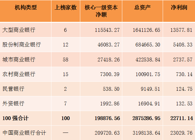 表1:2023年中国银行业100强基本情况