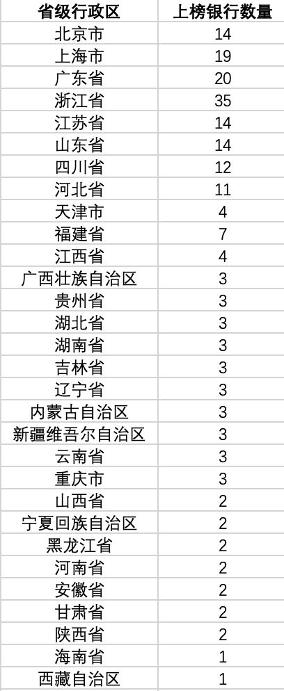 此外,江西省有4家银行上榜,广西壮族自治区、贵州省、湖北省、湖南省、吉林省、辽宁省、内蒙古自治区、新疆维吾尔自治区、云南省、重庆市各有3家银行上榜,山西省、宁夏回族自治区、黑龙江省、河南省、安徽省、甘肃省、陕西省各有2家银行上榜,海南省、西藏自治区各有1家银行上榜。