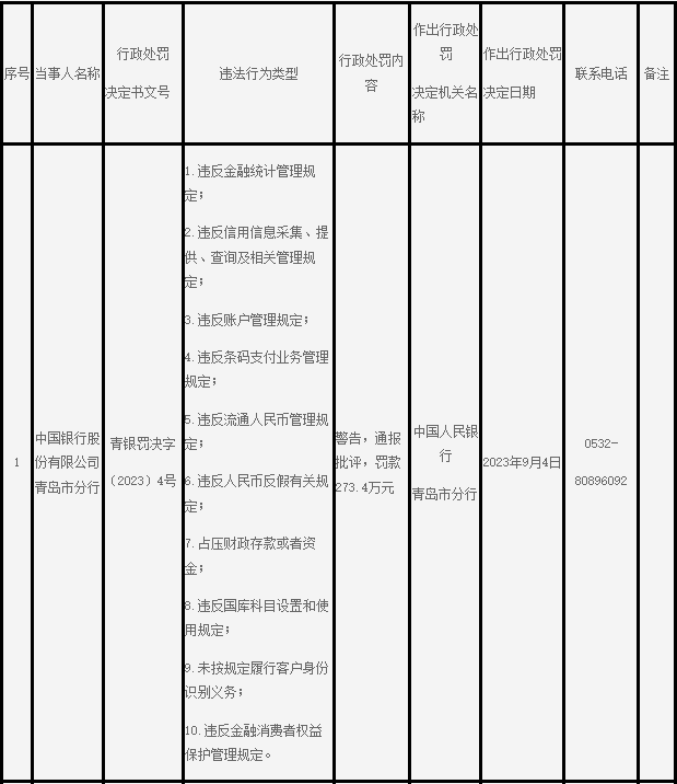 移动支付网9月11日消息,根据中国人民银行青岛市分行最新的行政处罚信息公示,中国银行因违反信用信息采集/提供/查询及相关管理规定、违反条码支付业务管理规定、未按规定履行客户身份识别义务、违反金融消费者权益保护管理规定等10项违法行为,被警告,通报批评并罚款273.4万元。
