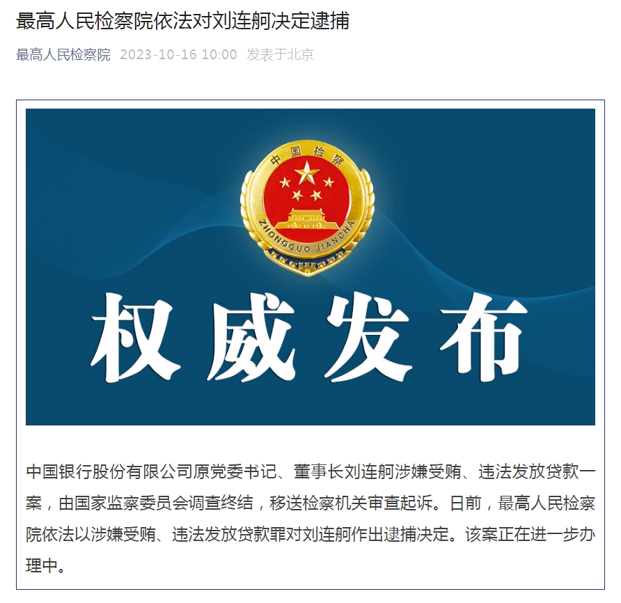 16日,最高检通报,中国银行股份有限公司原党委书记、董事长刘连舸涉嫌受贿、违法发放贷款一案,由国家监察委员会调查终结,移送检察机关审查起诉。日前,最高人民检察院依法以涉嫌受贿、违法发放贷款罪对刘连舸作出逮捕决定。