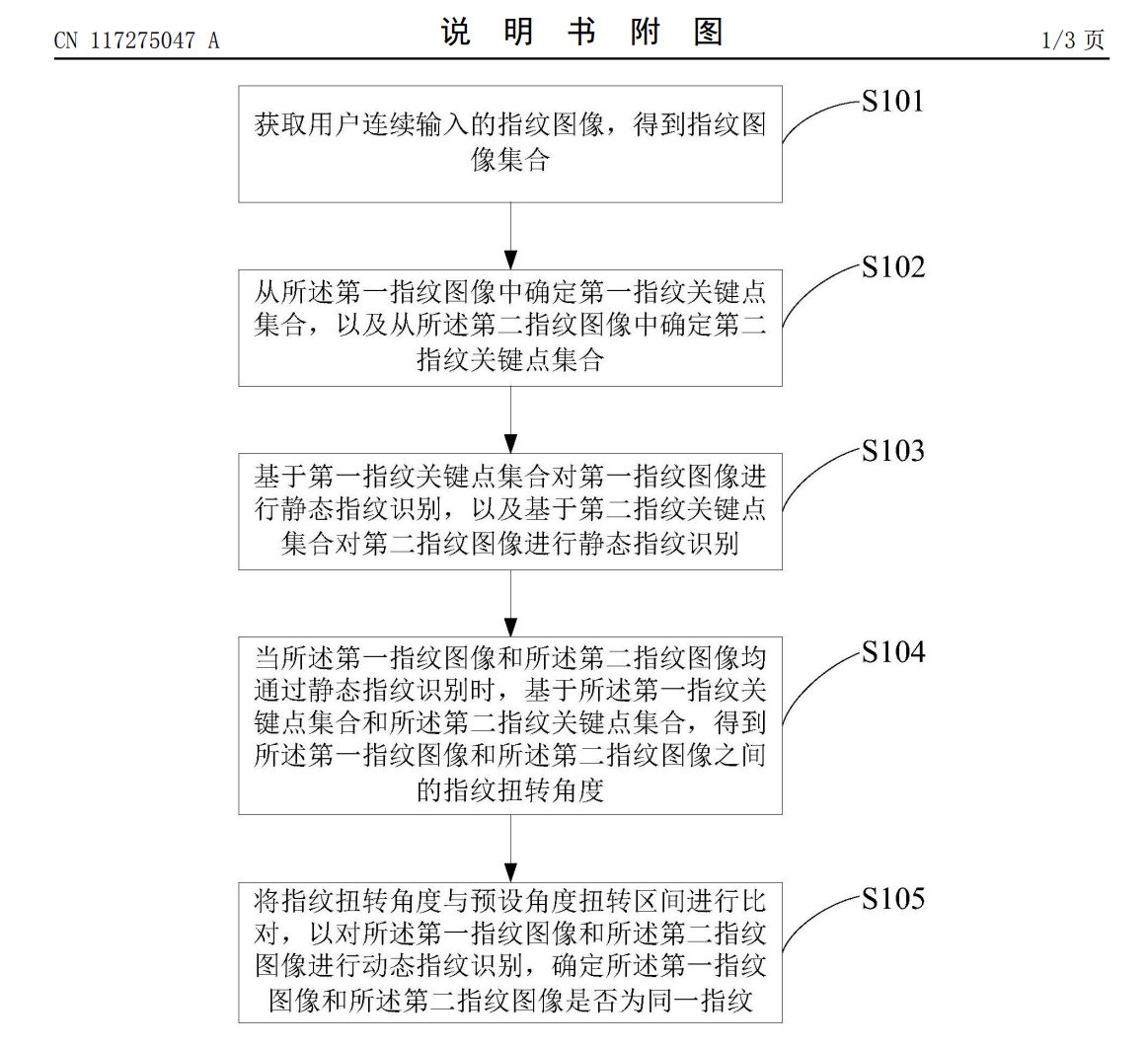 摘要显示,本申请公开了一种指纹识别方法、装置、电子设备及存储介质,可应用于人工智能领域或金融领域。获取用户连续输入的指纹图像得到指纹图像集合,指纹图像集合中至少包含相邻两次采集的第一指纹图像和第二指纹图像,基于第一指纹图像和第二指纹图像各自的指纹关键集合进行静态指纹识别,当通过静态指纹识别时,再确定两个指纹图像之间的指纹扭转角度,通过将指纹扭转角度与预设角度扭转区间进行比对来对两个指纹图像进行动态指纹识别。