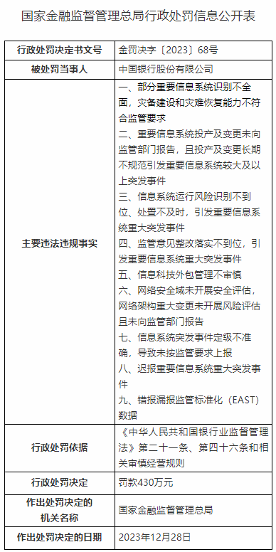 据国家金融监督管理总局网站消息,近日中国银行股份有限公司(以下简称“中国银行”),因存在多项违法违规事实,被国家金融监督管理总局罚款430万元。