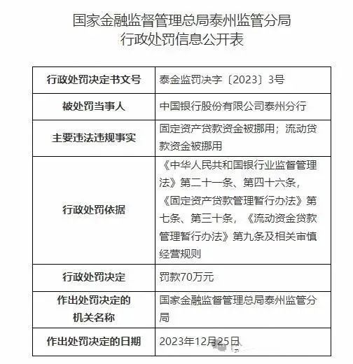 公开表显示,中国银行泰州分行因固定资产贷款资金被挪用;流动贷款资金被挪用,依据《中华人民共和国银行业监督管理法》第二十一条、第四十六条,《固定资产贷款管理暂行办法》第七条、第三十条,《流动资金贷款管理暂行办法》第九条及相关审慎经营规则,对其罚款70万元。