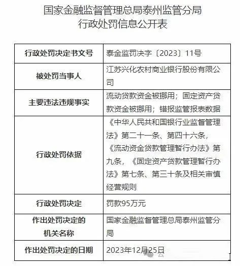 1月3日,国家金融监督管理总局泰州监管分局发布多个行政处罚信息公开表。因流动贷款资金被挪用;固定资产贷款资金被挪用;错报监管报表数据,江苏兴化农村商业银行股份有限公司及其相关负责人相继被罚。