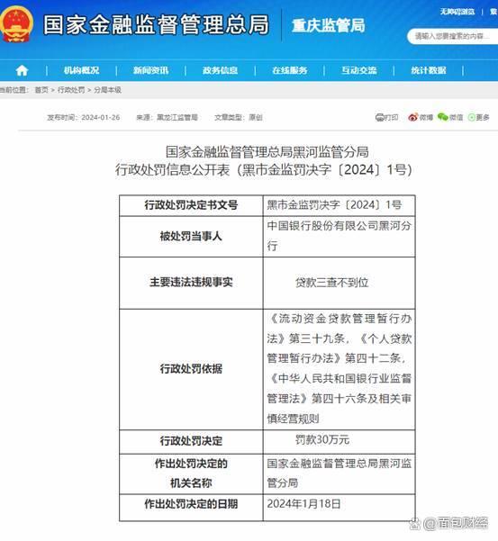 2024年1月26日,国家金融监督管理总局黑河监管分局公开披露了对中国银行股份有限公司黑河分行的行政处罚。