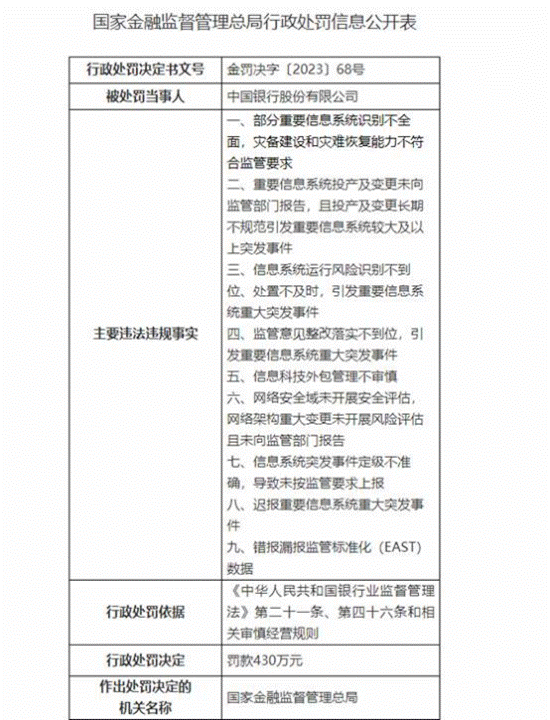 历史数据显示,2024年1月5日,中国银行因部分重要信息系统识别不全、重要信息系统投产及变更未向监管部门报告等九项违规,被国家金融监督管理总局罚款430万元。
