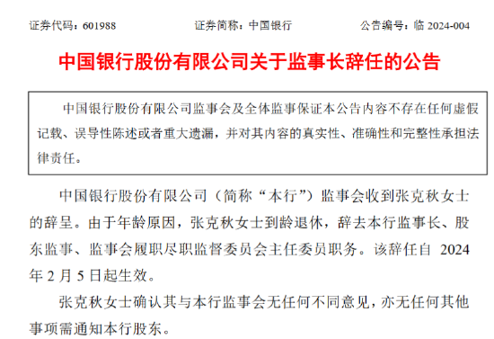 2月5日金融一线消息,中国银行今日发布关于监事长辞任的公告。公告显示,中国银行监事会收到张克秋的辞呈。由于年龄原因,张克秋到龄退休,辞去中国银行监事长、股东监事、监事会履职尽职监督委员会主任委员职务。该辞任自 2024年 2 月 5 日起生效。