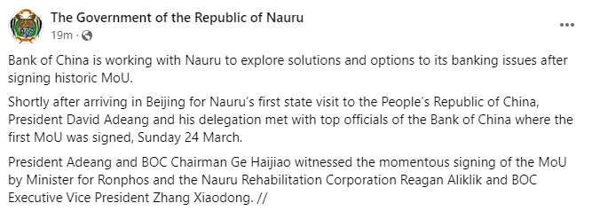 3月29日,瑙鲁政府在社交平台上宣布,中国银行正与瑙鲁合作探索解决其银行问题的方案和选项。此前在本月24日,瑙鲁共和国总统抵京进行为期六天的国事访问。瑙鲁政府称,在此期间,瑙鲁代表团与中国银行高层进行了会晤,并签署了一份谅解备忘录。