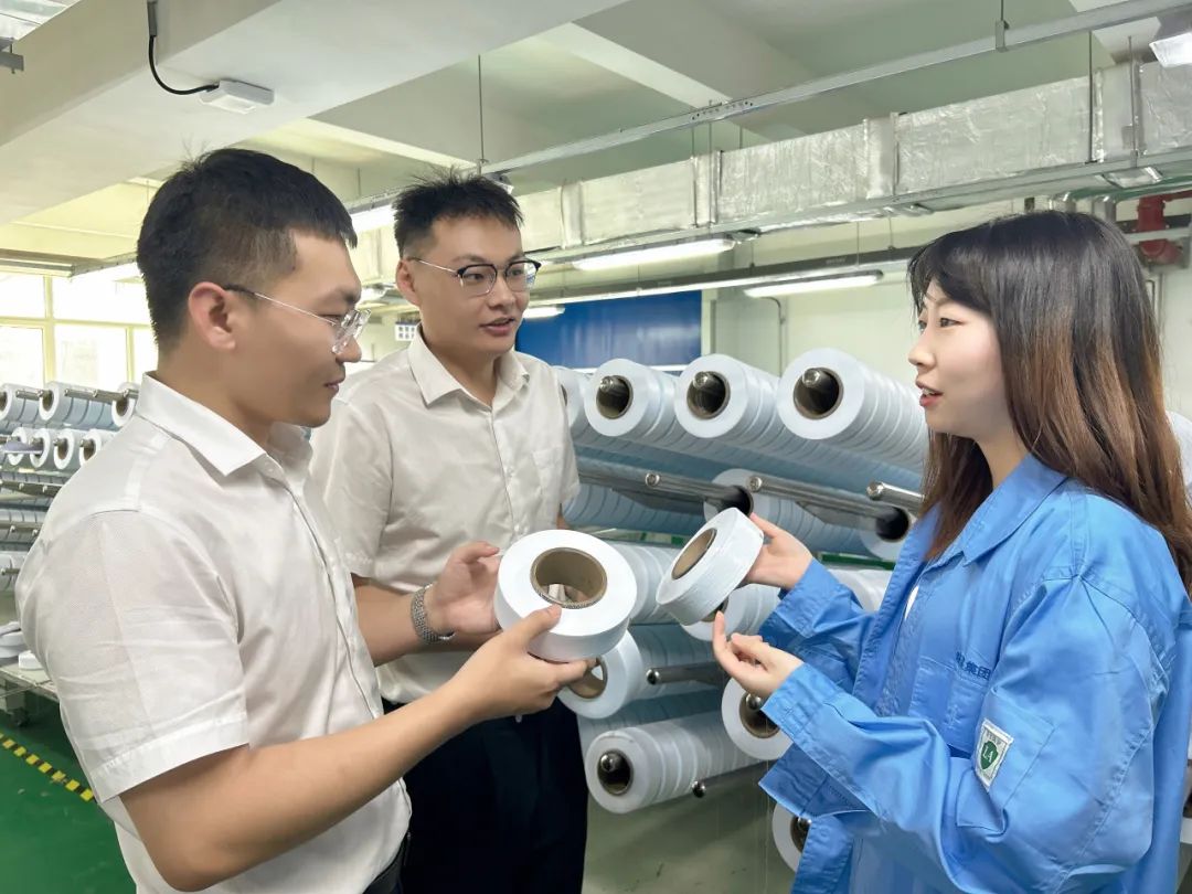 客户经理在氨纶企业成品车间了解产品生产销售情况