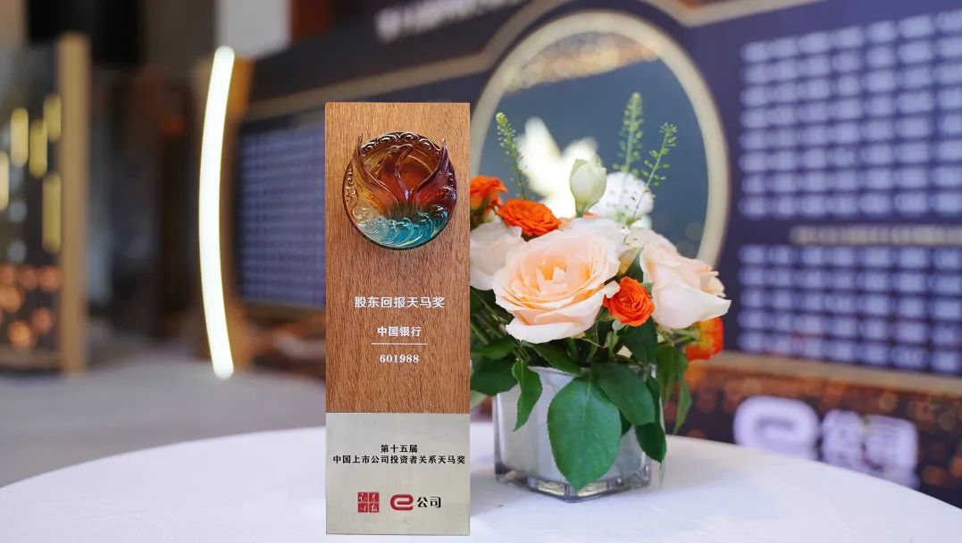 近日,在“第十五届中国上市公司投资者关系天马奖”系列奖项评选中,中国银行荣获“中国上市公司投资者关系股东回报天马奖”。