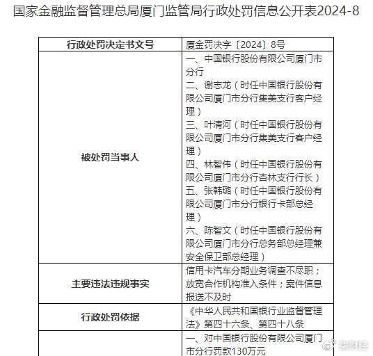 另一张罚单则剑指中国银行厦门市分行,该分行因信用卡汽车分期业务调查不尽职;放宽合作机构准入条件;案件信息报送不及时被罚130万元。