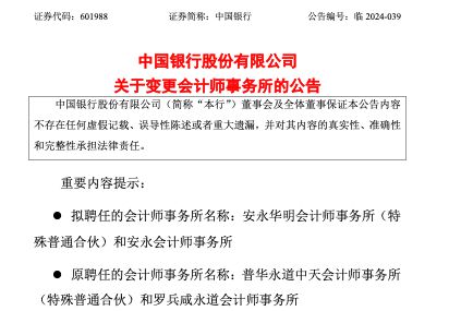 公告称,根据会计师事务所选聘相关规定,结合市场信息,基于审慎原则,并考虑中国银行业务需要,经履行招标程序并根据评标结果,中国银行拟聘用安永华明会计师事务所(特殊普通合伙)为2024年度国内审计师及内部控制审计外部审计师,聘用安永会计师事务所为2024年度国际审计师。中国银行已就变更事宜与原聘会计师事务所进行了沟通,原聘会计师事务所对变更事宜无异议。