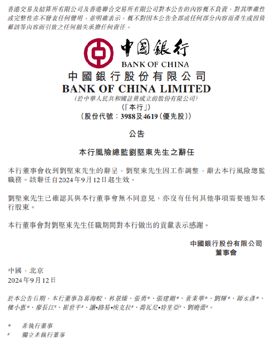 9月12日金融一线消息,中国银行公告,本行董事会收到刘坚东先生的辞呈。刘坚东先生因工作调整,辞去本行风险总监职务。该辞任自2024年9月12日起生效。