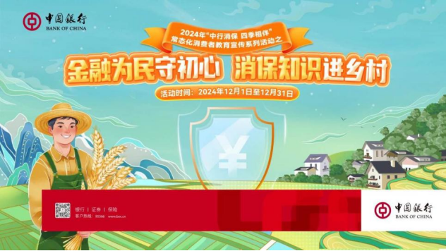 为切实提升广大农村地区金融服务质效,将消费者权益保护工作融入乡村金融工作体系,中国银行坚持以人民为中心的价值取向,于近日开展“金融为民守初心,消保知识进乡村”主题宣传活动,进一步助力提高乡村振兴金融常态化教育宣传力度。