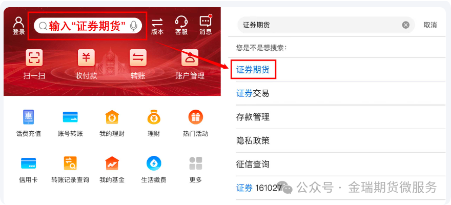 登录中国银行App,首页搜索框输入“证券期货”并点击进入;