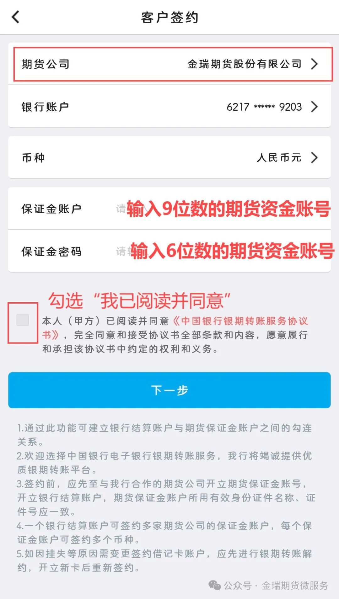 客户签约页面,期货公司选择“金瑞期货股份有限公司”,保证金账号输入9位数期货资金账号,保证金密码输入6位数资金密码;勾选“我已阅读并同意”,确认信息后完成签约流程。