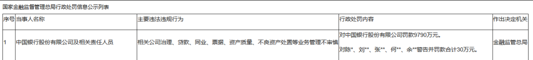 主要处罚原因为:相关公司治理、贷款、同业、票据、资产质量、不良资产处置等业务管理不审慎。对中国银行股份有限公司罚款9790万元。对陈*、刘**、张**、何**、余**警告并罚款合计30万元。
