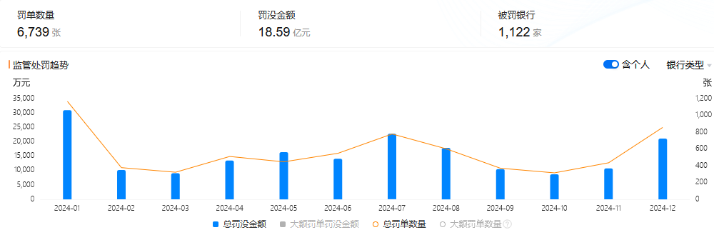 根据企业预警通统计数据,政策性银行、国有银行、股份制银行、城商行、农商行、民营银行等各类银行金融机构,2024年全年收到监管部门罚单合计6738张,总罚款金额达18.59亿元。