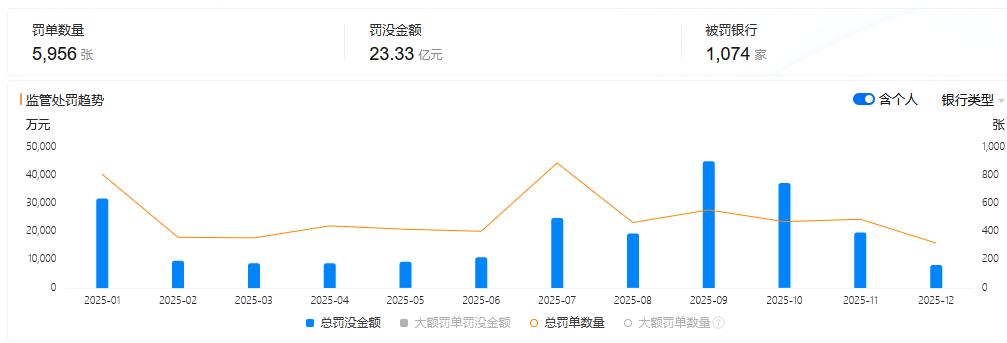 而在2025年截至目前上述银行金融机构合计收到监管部门罚单5956张,总罚款金额达23.33亿元,虽然罚单数量有所下降,但总体罚款金额较2024年出现了明显增长,增长幅度达25%,大罚单数量明显增多,强监管是金融行业的整体趋势。