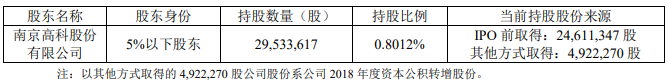 截至目前,南京高科持有南京证券无限售条件流通股2953.36万股,持股比例为0.8012%。其中,IPO前取得2461.13万股,其他方式取得492.23万股。