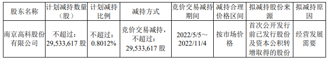 昨日晚间,南京证券(证券代码:601990)发布公告称,南京高科股份有限公司(以下简称“南京高科”)因经营发展需要,拟于2022年5月5日至2022年11月4日期间,以集中竞价交易方式减持不超过2953.36万股公司A股股票(不超过公司总股本的0.8012%)。减持价格按市场价格确定。若自目前起公司发生送股、资本公积金转增股本等股份变动事项,上述减持股份数量将作相应调整。