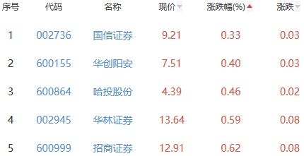 国信证券、华创阳安、哈投股份、华林证券和招商证券位列板块涨幅榜后五位,涨幅分别为0.33%、0.40%、0.46%、0.59%和0.62%。