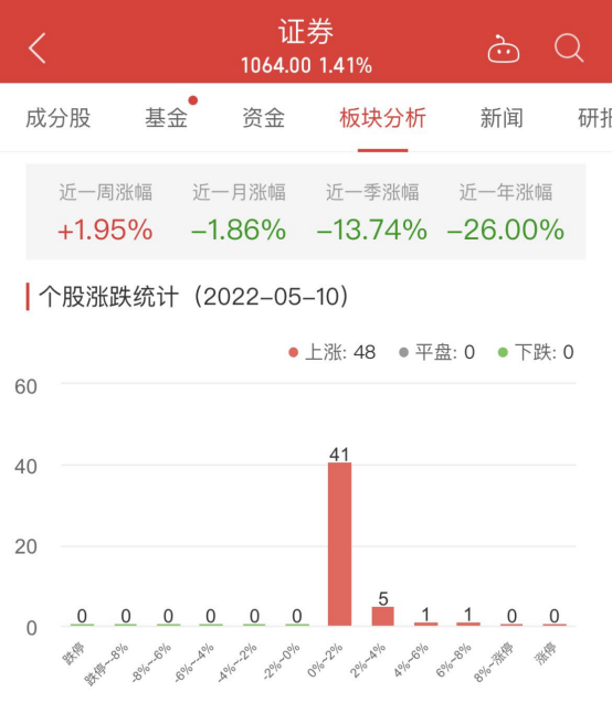 中国经济网北京5月10日讯今日,证券板块整体涨幅1.41%,其中48只股票上涨,0只股票平盘,0只股票下跌。