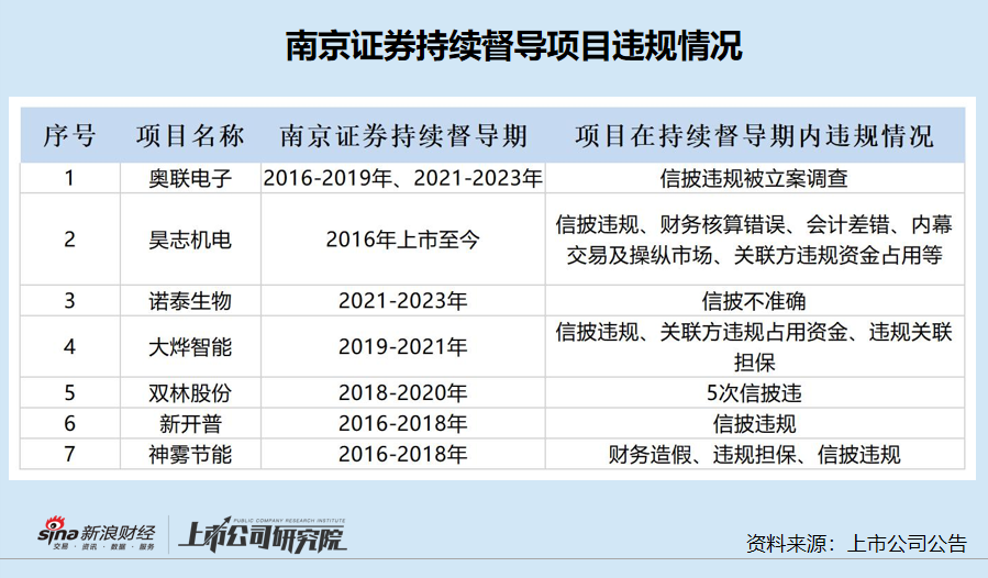 wind显示,自2014年至今的十年之中,南京证券保荐和持续督导的IPO、再融资、重组的公司合计17家,其中7家在持续督导期内严重违规遭罚,占比超41%。7家项目分别是大烨智能、双林股份、神雾节能(维权)、新开普、诺泰生物、奥联电子、昊志机电。