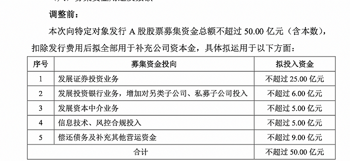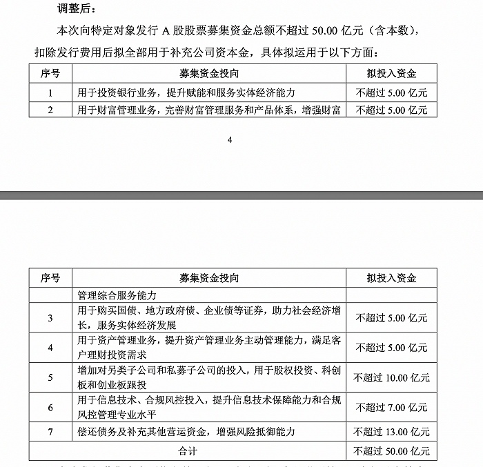 经过调整,50亿元募资额改为投向7方面,其中删除了两融业务,将自营业务的具体募资计划更加细化,并且增加了对于信息技术、合规风控的投入。