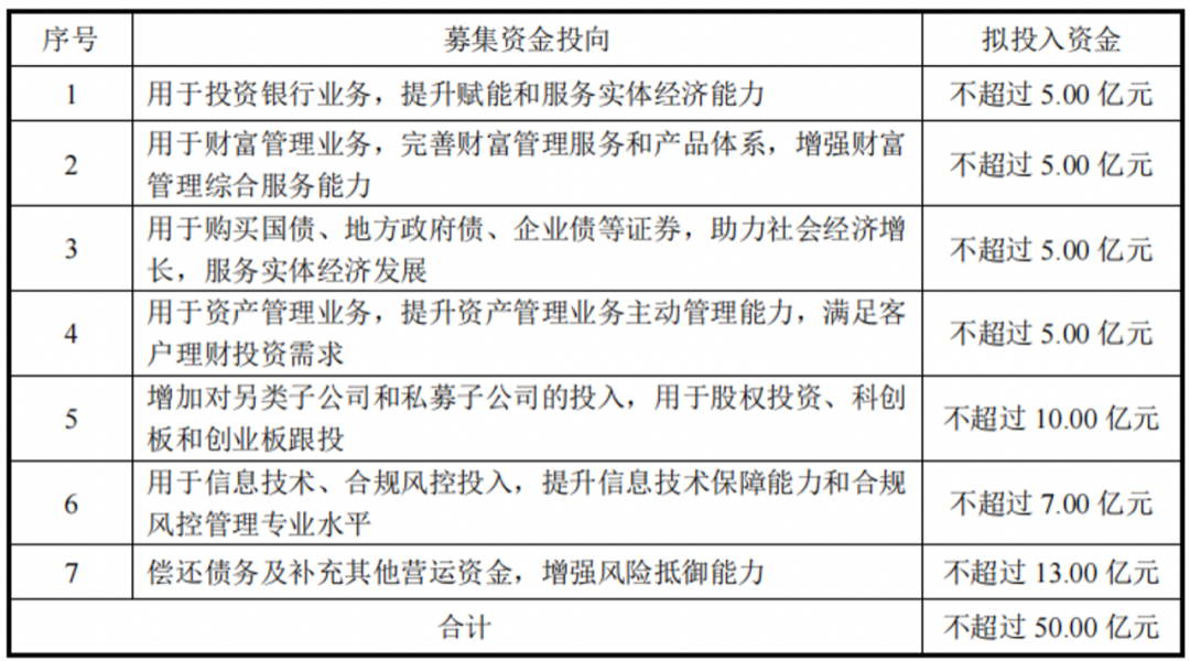 “本次发行募集资金主要用于公司主营业务条线的发展以及信息技术和合规风控投入等,有利于推动公司业务的均衡发展,促进公司综合竞争力及服务实体经济能力的提升。”南京证券表示,证券公司目前正在由传统通道型券商向现代综合金融服务提供商转型,为更好地顺应行业发展趋势,公司本次拟分别投入5亿元用于财富管理业务和资产管理业务,推动完善财富管理服务和产品体系,增强财富管理综合服务能力,同时提升资产管理业务主动管理能力,更好地满足客户理财投资需求。