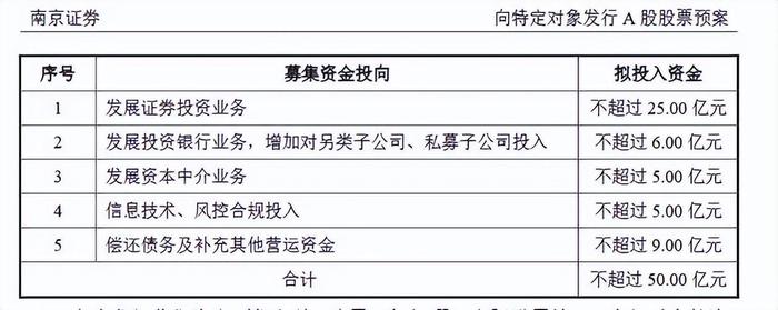 根据官方口径,南京证券的这次募资拟主要用于发展证券投资业务、偿还债务及补充其他营运资金、发展投资银行业务,增加对另类子公司、私募子公司投入等三部分,预计投入资金分别为25亿元、9亿元、6亿元。