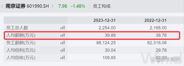 2023年末,南京证券职工总数2254人,当年人均创利30万元,人均薪酬大约40万元,比2022年增加大约1万元,在省内四大上市券商中也靠后,但在南京市内的上市公司中,这个薪酬还是相当具有竞争力的。而2024年,预计券商业绩都会有明显增长,员工薪酬或有提升。