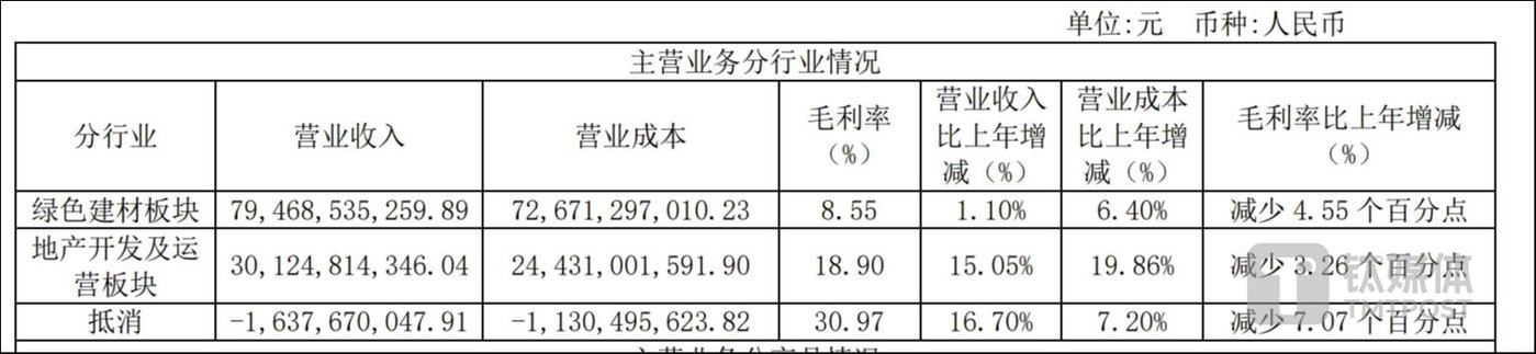 房地产行业的下行必然会拖累公司的业绩。2023年年报指出,在公司主营业务中,来自绿色建材板块和地产开发及运营板块的营收分别为794.69亿元、301.25亿元,较上年分别增长1.1%、15.05%;相应的毛利率分别为8.55%、18.9%,较上年分别减少4.55个百分点、3.26个百分点。