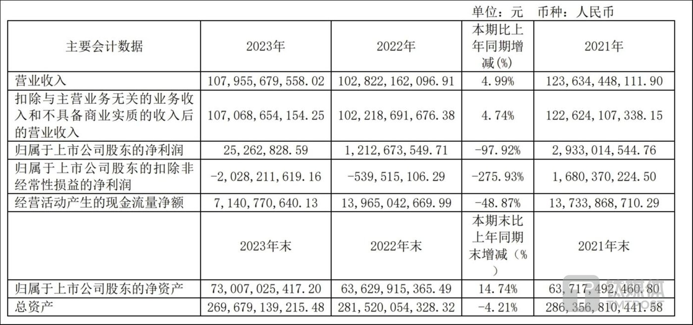 过去一年,金隅集团取得营业收入约1079.56亿元,同比增加4.99%;实现归母净利润约2526.28万元,同比减少97.92%;扣非净利润为亏损20.28亿元,2022年同期为亏损5.4亿元,亏损情况进一步扩大。
