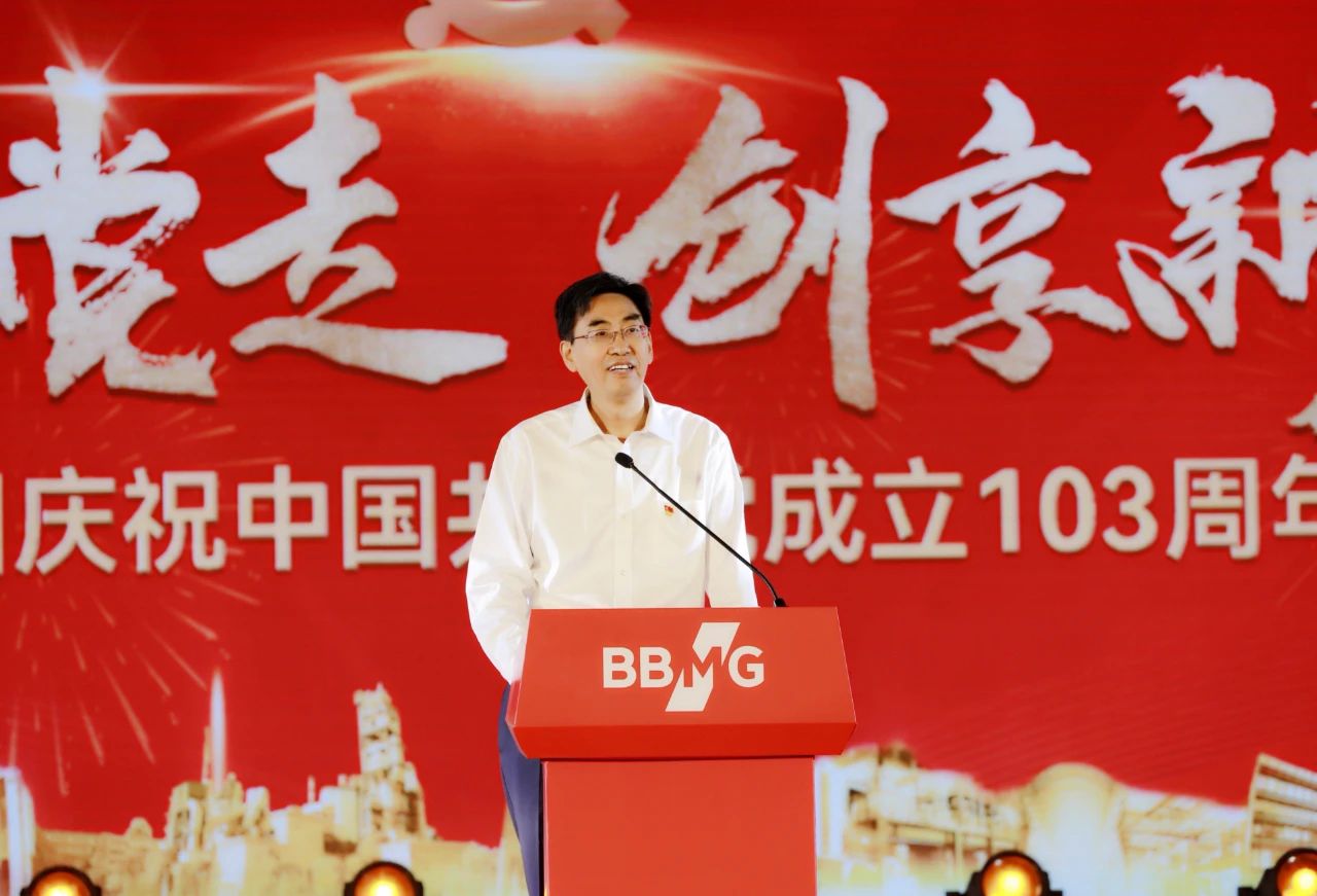 姜英武在讲话中回顾了中国共产党103年的光辉奋斗历程。103年来,中国共产党领导人民创造了彪炳史册的历史伟业,书写了中华民族几千年来最为恢宏的华彩史诗。历史和现实雄辩地证明,只有坚定不移听党话、跟党走,才能战风雨、打胜仗,不断从胜利走向胜利。在党的领导下,金隅集团实现了从小到大、由弱变强的蝶变,实践证明坚持党的领导,以实干者为本,敢于成功并善于成功,是金隅事业大踏步前进的制胜法宝和成功密码。面对复杂严峻的发展形势,广大党员干部职工要保持战略定力,坚定必胜信心,抢抓发展机遇,发挥自身优势,以非常之举应对非常之难,鼓足干劲、真抓实干、乘势而上,赢得优势、赢得主动、赢得未来。各级党组织要深入推进全面从严治党,扎实开展党纪学习教育,推动党建与生产经营深度融合,充分发挥党委领导作用、党支部战斗堡垒作用和党员先锋模范作用,切实将党建优势转化为实实在在的发展成效。