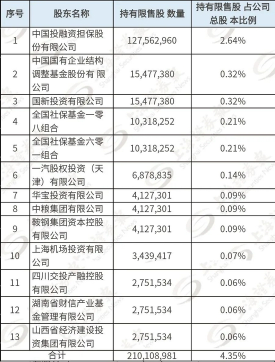 本次上市流通的限售股2.1亿股包括首次公开发行前股东中国投融资担保股份有限公司持有的1.28亿股,以及首次公开发行中向战略投资者配售的0.83亿股,共涉及股东数量13名。