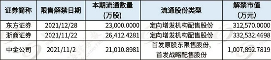 Choice数据显示,中金公司约2.1亿股首发原股东限售股份、首发战略配售股份将于11月2日上市流通。按最新收盘价计算,合计解禁市值超过100亿元。此外,年底前还有浙商证券、东方证券面临解禁,规模都在2亿股以上。