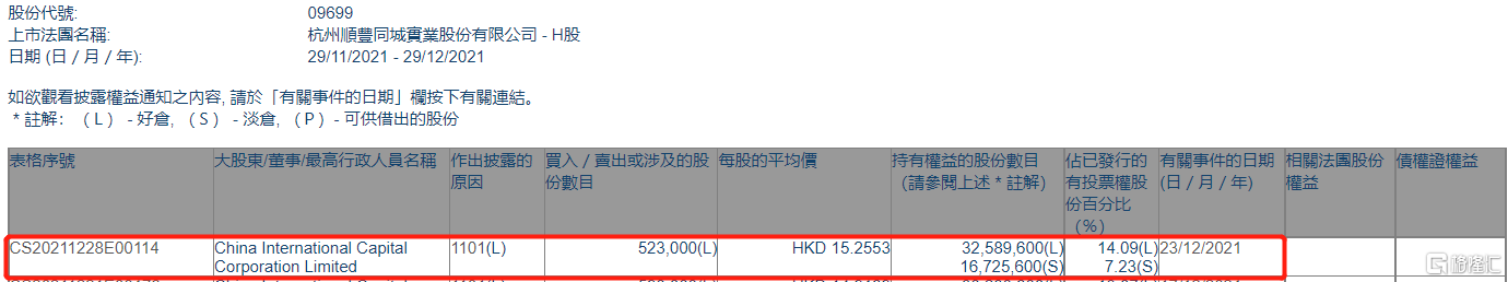 根据联交所最新权益披露资料显示,2021年12月23日,顺丰同城(09699.HK)获China International Capital Corporation Limited在场内以每股均价15.2553港元增持好仓52.3万股,涉资约797.85万港元。